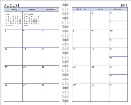 Features: 2015 Calendar Year. Sturdy wrapped leatherette cover. Spiral bound. One week per two-page layout, with 7 a.m. to 9 p.m. quarter-hourly ruled format. Three-year calendar, reference sections, and pages for telephone/address entries.